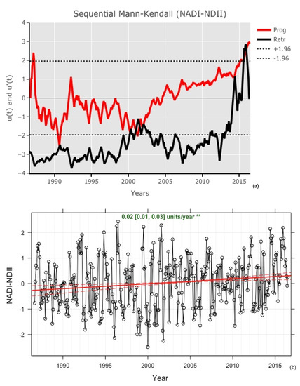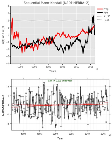 The above equation gives a forward sequential statistic which is normally called the progressive statistic. To calculate the backward/retrograde statistic values (u’(t)), the same time series (x1, x2, x3, ..., xn) is used, however, statistic values are calculated by starting from the end of the time series. The combination of the forward and backward sequential statistic allows for the detection of the approximate beginning of a developing trend [51]. Additionally, in this study, a 95% confidence level was considered, which means critical limit values are ±1.96. This method has been successfully utilized in studies of trends detection in temperature and precipitation [55,56]. Further to the MK and SQ-MK, the Theil-Sen trend methodology was used to the slope of the trend for both NADI-NDII and NADI-MERRA–2. The Theil-Sen line is a nonparametric alternative to the parametric ordinary least squares’ regression line. An ordinary least squares regression line models how the mean concentration changes linearly with time; a Theil-Sen line models how the median (50th percentile) concentration changes linearly with time. The Theil-Sen method [57,58], which is based on Kendall’s rank correlation, is used to estimate trends and is commonly used in combination with the Mann-Kendall test to provide both an estimate and a test for trend [59]. The Theil-Sen method considers measurements Y1, Y2, Y3, ..., Yn of an environmental variable (say the concentration of a pollutant) taken at times t1, t2, t3, ..., tn, where t1 ≤ t2 ≤ t3 ≤ ... ≤ tn (the time intervals do not necessarily have to be equal), as independent observations. The gradient Dk, (k = 1, 2, 3, ..., N), for each N pairs of observations taken at times tj and ti such that 1 ≤ i ≤ j ≤ n and ( tj − ti ) > 0, can be calculated as: