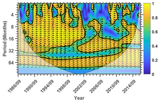 Figure 11 shows the normalised wavelet power spectrum for NADI-NDII and NADI-MERRA–2 time series from the period of 1986 to 2016. The “u” shaped solid lines in both figures represent the cone of influence (COI) [67]. This is the region of the spectrum that is considered during the analysis. According to [68], COI indicates the area where edge effects occur in the time series. The thick black contour within the COI indicates the 95% significance regions of the confidence interval [61]. Wavelet analysis was used in this study was used to identify dominant variability mode that may be present in the two NADI’s calibrated using NDII and MERRA–2. A strong uninterrupted strong power spectrum was notable between the eighth and 18-month period for NADI-NDII while the NADI-MERRA–2 showed the same between the seventh and 17-month period. These were noted between 1998–2002 and 1994–2001 for NADI-NDII and the NADI-NDII, respectively. The wavelet coherence analysis between NADI-NDII and NADI-MERRA–2 is presented in Figure 12. Wavelet coherence is designed to reveal the coherence and phase lag between two time series as both a function of time and frequency [69]. This approach of time series analysis is good at indicating the teleconnection between two independent time series. The arrows represent a phase relationship, in which case when the arrows pointing to the right indicates a positive phase between two cross-wavelet parameters. An anti-phase is shown by arrows pointing to the left while the upwards or downward arrows show that either of the parameter being analysed is leading (or lagging).