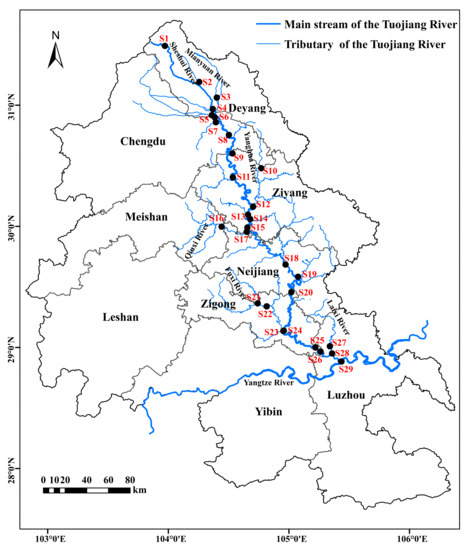 The Tuojiang River is a tributary of the upper Yangtze River, located in Southwest China (Sichuan Province). The Tuojiang River is 712 km long and covers an area of 32,900 km2 with an annual average precipitation of 1200 mm and runoff of 35.1 billion m3. The Tuojiang River flows through Deyang, Chengdu, Meishan, Leshan, Ziyang, Neijiang, Zigong, Yibin, and Luzhou (Figure 1), converging with the Yangtze River in the city of Luzhou. The water and sediment samples were collected at twenty-nine sampling sites (S1–S29, Figure 1) from the upper reaches to the lower reaches along the Tuojiang River in September 2020 (dry season), and March 2021 (wet season). These samples can be divided into the upper reaches (S1–S8), middle reaches (S9–S17), and lower reaches (S18–S29). These sampling sites were mainly based on the layout of national control and provincial control monitoring sections of the Tuojiang River. Coordinates of the sampling sites are provided in Table S1.