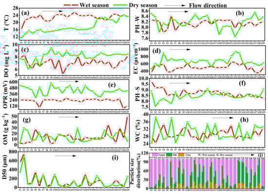 Spatial–temporal of physicochemical parameters: (a) temperature, (b) pH, (c) dissolved oxygen, (d) electrical conductivity and (e) reduction–oxidation potential of water, and (f) pH, (g) organic matter, (h) water content, (i) median sediment size, and (j) particle size distribution of sediments in the Tuojiang River (S1–S29 are defined in Figure 1).