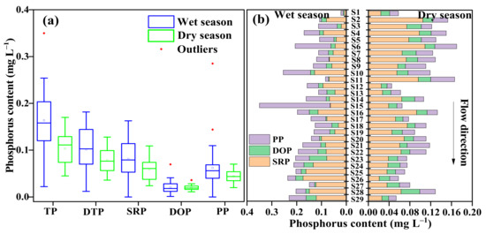Phosphorus fractions distribution in different seasons (a) and sampling sites (b) in the water of the Tuojiang River (S1–S29 are defined in Figure 1).