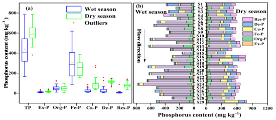 The TP-S concentrations were 166.5–783.2 mg kg−1 (mean = 438.2 mg kg−1) and 380.8–786.6 mg kg−1 (mean = 594.7 mg kg−1) in the wet and dry seasons, respectively (Figure 4a). The TP-S concentration was higher in the dry season than in the wet season. Compared with the background value of 453 mg kg−1 for soil phosphorus in Sichuan Province [18], the sediment of the Tuojiang River exhibited a certain degree of phosphorus pollution. The Ex-P concentrations were 3.9–38.2 mg kg−1 (mean = 12.0 mg kg−1) and 2.7–41.0 mg kg−1 (mean = 16.6 mg kg−1) in the wet and dry seasons, respectively. Org-P concentrations ranged from 10.0 to 124.0 mg kg−1 (mean = 53.8 mg kg−1) and 3.9 to 98.2 mg kg−1 (mean = 47.3 mg kg−1) in the wet and dry seasons, respectively. The Fe-P was the dominant phosphorus fraction in all the samples, with concentrations ranging from 87.9 to 619.0 mg kg−1 (mean = 306.6 mg kg−1) and 154.0 to 388.0 mg L−1 (mean = 250.7 mg kg−1) in the wet and dry seasons, respectively. Ca-P concentrations ranged from 7.9 to 88.6 mg kg−1 (mean = 27.5 mg kg−1) and 36.6 to 273.0 mg kg−1 (mean = 85.6 mg kg−1) in the wet and dry seasons, respectively. The De-P ranged from 4.2 to 158.0 mg kg−1 (mean = 30.8 mg kg−1) and 36.6 to 273.0 mg kg−1 (mean = 114.2 mg kg−1) in the wet and dry seasons, respectively. The Res-P concentrations ranged from 0.4 to 88.2 mg L−1 (mean = 7.5 mg kg−1) and 35.2 to 141.0 mg kg−1 (mean = 80.3 mg kg−1) in the wet season and dry seasons, respectively. The mean concentrations of Org-P and Fe-P were higher in the wet season than in the dry season. The TP-S, Ex-P, Ca-P, De-P, and Res-P concentrations had significant seasonal variations (p < 0.05). The Fe-P and Org-P had no significant seasonal variations (p > 0.05). The Fe-P concentrations shared the same spatial distribution pattern as the TP-S concentrations (Figure 4b). The TP-S contents were relatively high at S24, S23, and S19 in the wet season, and at S20, S29, and S17 in the dry season. The Fe-P contents were relatively high at S21, S23, and S24 in the wet season and at S13, S19, and S25 in the dry season, which indicated significant phosphorus pollution and high potential for sediment release at these sampling sites.
