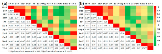 Correlation analysis of different phosphorus fractions in water–sediment phases in the wet season (a) and dry season (b) in the Tuojiang River.