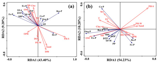 Redundancy analysis diagram between phosphorus fractions and environmental factors of water and sediments in the wet season (a) and dry season (b) in the Tuojiang River.