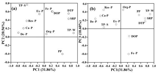 The first three PCs explained 63.02% of the phosphorus fraction variation, and PC1 explained 31.86% of the variation. PC1 was negatively correlated with Ca-P, De-P, and Res-P, which suggested that the sources of these three phosphorus fractions may have mainly originated from soil erosion and agricultural production [25,27]. PC1 was positively correlated with TP-W, DTP, SRP, and PP, which suggested that these phosphorus fractions may have originated from anthropogenic activities other than soil erosion and agricultural production. The PC2 accounts for 20.56% of the variation and was correlated with TP-S, Fe-P, Ex-P, and DOP. Fe-P was an effective indicator of industrial and domestic emissions [25]. Therefore, these phosphorus fractions may have been derived from great quantities of domestic and industrial wastewater emissions into the Tuojiang River. The PC3 accounts for 10.60% of the variation and showed a high positive loading on Org-P only (Figure 7b). Aquatic plant residues, algae, and agricultural nonpoint-source pollution all contribute to Org-P in sediments [28]. These results were consistent with previous studies [13].