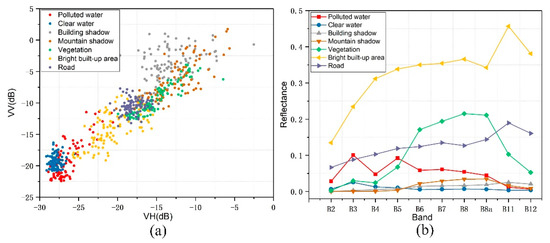 To assess the spectral and polarization feature differences, water and non-water samples were selected to represent the seven land-cover types examined—polluted water, clear water, built-up shadow, mountainous shadow, vegetation, bright built-up, and road—from Sentinel-1/2 imagery within the study regions (Figure 3). Notably, large spectral and polarization differences in feature space were seen between LWBs (clean and polluted water) and all other land-cover types (built-up shadow, mountainous shadow, vegetation, and road).