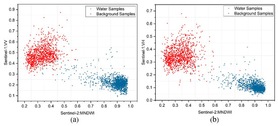 Water and non-water background samples plotted in feature space formed by Sentinel-1: (a) VV and (b) VH backscatter vs. Sentinel-2 MNDWI.