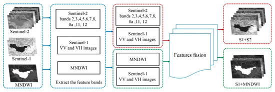 Image fusion methods can be classified into three different levels: pixel, feature, and decision [33]. The most relevant method of data fusion is to combine features in order to create value added features. In this study, feature stacking was employed for feature fusion. In the first fusion scheme, Sentinel-2 bands 2, 3, 4, 5, 6, 7, 8, 8a, 11, 12, and Sentinel-1 VV and VH were fused to a 12 dimensional features by feature stacking. In the second fusion scheme, MNWDI data and Sentinel-1 VV and VH were fused to three-dimensional features by feature stacking (the conceptual fusion frameworks are illustrated in Figure 5).