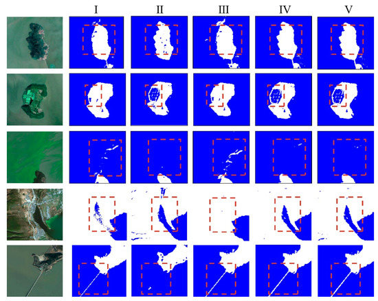 Comparison of LWB extraction in urban lakes across Methods I–V. The subs (a–c) of Figure 10 are used to show the differences among the extraction results.