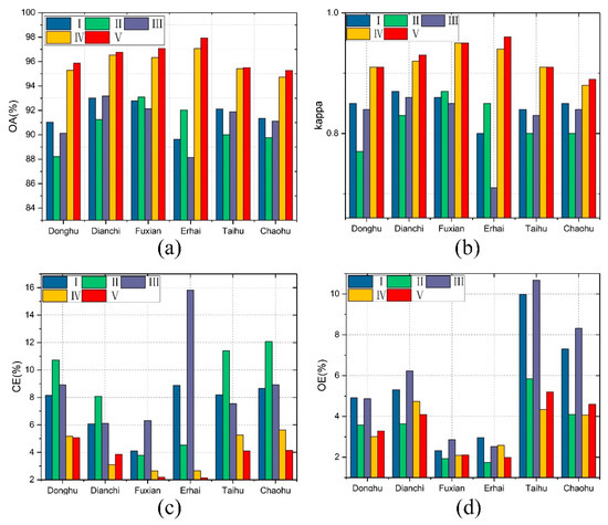 Accuracy analysis across the six lakes. (a) Overall accuracy. (b) Kappa coefficients. (c) Commission error. (d) Omission error.