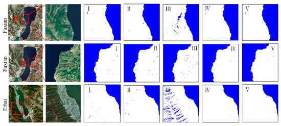 Comparison of LWB extraction in polluted lakes for Methods I–V. The subpictures (a–c) of Figure 12 are used to show the differences among the extraction results.