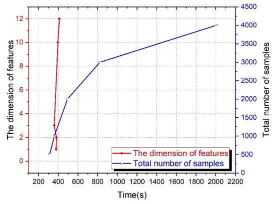 In this paper, the LWB extraction mainly includes three steps: feature analysis and extraction, feature fusion, and classification. In the feature analysis and extraction stage, the operation is simple, and the computational complexity is low. Feature fusion mainly uses the layer stacking to generate multidimensional data from Sentinel-1/2 data, and this process is also relatively low in computational complexity. Therefore, the computational complexity of the entire process mainly depends on the efficiency of SVM. The complexity of SVM is considered from the following two aspects: the dimensions of features and total number of samples. We set up two sets of experiments to verify: (1) The number of training samples remains unchanged at 1000; the feature dimensions of the input classifier are: 1, 2, 3, 10, and 12 (the same as the feature dimensions of the five methods proposed in this study); and the running time under different feature dimensions is recorded. (2) The feature dimension is 1 and remains unchanged; the numbers of input training samples are: 500, 1000, 2000, 3000, 4000; and the running time under different number of samples is recorded.