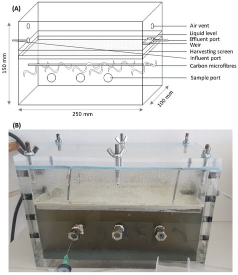 For passive volume control, the feed (influent) and effluent ports were set at the same level, resulting in a working volume of approximately 2 L based on the height. Six threaded pillars were embedded in the reactor walls, at the corners and midway along the long side, allowing a lid with an airtight seal to be fitted. The reactor contained carbon microfibers held between two aluminum plates and suspended in the bulk liquid as a surface for microbial attachment to prevent microbial washout (Figure 1A). The front of the reactor contained three sampling ports at approximately half the height of the bulk liquid (Figure 1A,B). Each port was sealed with a rubber septum allowing sampling using a syringe fitted with a 70-mm hypodermic needle. A plastic mesh screen was used to harvest the biofilm. This was suspended on wire supports just below the liquid surface. A rectangular weir was fitted to the outlet port to prevent washout of the biofilm. Two additional ports, located midway between the influent/effluent ports and the lid, allowed air flow and could be opened or closed depending on the O2 requirements.