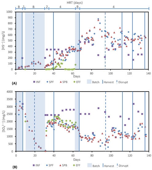 The HS− and SO42− concentrations measured immediately after HLFCR1 was started were 187 mg/L and 3200 mg/L, respectively (Figure 2A,B). The HS− concentration decreased rapidly over the first few days when the FSB was absent or very thin, which allowed O2 to readily enter the bulk liquid. Complete FSB formation is crucial to the reactor’s operation, so that O2 mass transfer to the bulk liquid is limited, and BSR can occur in an anaerobic environment.