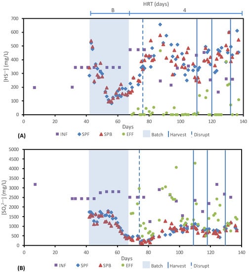 The data indicated a period of adaptation in HLFCR2 during the start of the batch phase, during which time the HS− concentration decreased from 534 mg/L on day 43 to a minimum of 84 mg/L on day 56 (Figure 3A). This was not due to an increased SO but, rather, a lack of SR (Figure 3B).