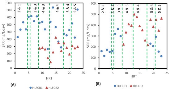 The SR rate (SRR) and SO rate (SOR) data for each HRT are plotted in Figure 4. HLFCR1 was able to achieve SRRs of up to 1049 mg SO42−/L.day (10.9 mmoles/L.day) in the bulk liquid, while HLCFR2 reached 513 mg SO42−/L.day (5.3 mmoles/L.day), with an overall rate of 444 mg/L.day (4.6 mmoles/L.day). The higher SO42− loading and utilization of the more readily available substrates in the influent to HLFCR1 were responsible for higher rates being achieved in HLFCR1 than in HLFCR2. These SRR were on par with those obtained by Boshoff et al. [23], where TWW was treated using active methods, achieving 250–600 mg SO42−/L.day. Studies that achieved higher rates (e.g., 2200 and 2920 mg/L.day by Oyekola et al. [4] and Sabumon [25], respectively) were most likely due to higher SO42− loading (10 and 2.85 g/L.day, respectively). In addition, these studies used more readily available carbon sources in comparison to TWW. Loading directly affects the SRR, with a near-first-order relationship until substrate inhibition occurs [26].