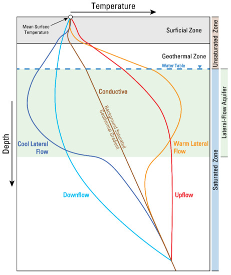 Schematic showing typical temperature profile deviations from the conductive case because of horizontal or vertical groundwater flow. The surficial zone refers to depths in which temperatures are influenced by relatively short-term (e.g., daily, seasonal) temperature variations.