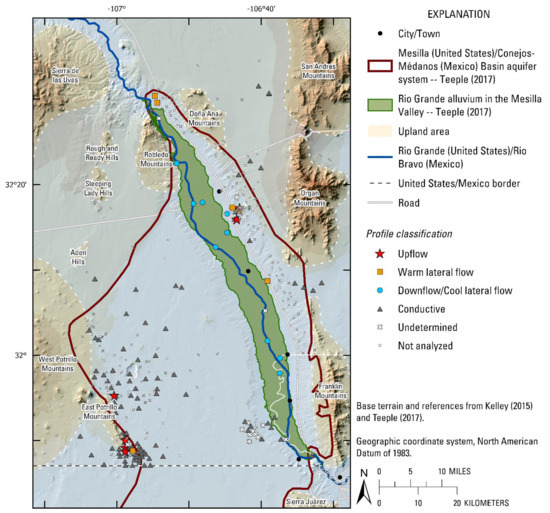 Downflow/cool lateral flow profiles (nine profiles) were all within or near the Mesilla Valley. This indicates surface water recharge and cool lateral groundwater flow within the permeable Rio Grande alluvium in the valley. This finding also agrees with previous work that indicated negligible recharge outside of the Mesilla Valley because of the depths to groundwater, effective water consumption by desert vegetation, and the presence of caliche [17,20,29].