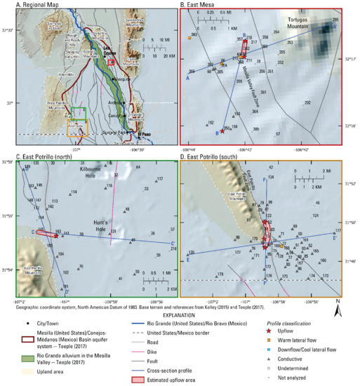 Areal estimates of upflow and relation of faults and dikes to profile classifications for the East Mesa (B), East Potrillo (north) (C) and East Portrillo (south) (D) upflow zones [21,22]. Extents of the insets are given on the regional map inset (A). Faults and dikes are from Sweetkind (2017) [27]. Profile locations are labeled with their profile ID number from Pepin et al. (2019) [18].