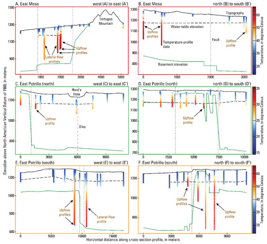 East–west and north–south thermal cross sections for the East Mesa (A,B), East Potrillo (north) (C,D) and East Potrillo (south) (E,F) upflow zones. These plots include temperature observations overlain onto basement stratigraphy, dikes, and faults from Sweetkind (2017) [27]. Additionally, topography from a USGS 1/3 arc-second (about 10 m) digital elevation model [41] is shown along with water table elevations estimated from the well records, smoothed temperature profiles and their derivatives, and nearby USGS water level data [23]. The temperature scale differs for the East Potrillo (north) cross sections (C,D) relative to the other cross sections. Surface projections are used to plot dikes and faults and their corresponding dips are not depicted.
