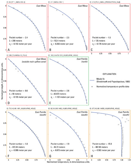 Normalized temperature profiles and their best-fit Bredehoeft and Papadopulos (1965) analytical solution [38] for profiles associated with the East Mesa (A–D), East Potrillo (north) (E) and East Potrillo (south) (F–H) upflow zones. Best-fit Peclet numbers, as determined from root-mean-squared error (RMSE) minimization, along with the length over which temperatures were analyzed (L) and estimated vertical specific discharge (qz) are displayed on each plot for reference. The Peclet number and L are inversely related in equation 2, meaning that high Peclet numbers across small depth intervals will maximize vertical flux rates. Negative Peclet numbers and vertical specific discharge values correspond to upflow curvature. Precision of displayed values is for research reproducibility purposes and does not reflect value uncertainty. Profiles are labeled with their profile ID number from Pepin et al. (2019) [18].
