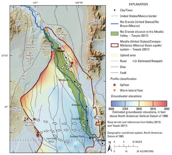 Anticipated flow patterns of upwelling and warm lateral flowing groundwater, as informed by groundwater-elevation mapping from Robertson et al. (2021) [20,21,22]. Estimated flowpath arrows are oriented perpendicularly to groundwater elevation contours with flow directed down hydraulic gradient. Groundwater elevations depict groundwater flow towards the Rio Grande and southern Mesilla, along with flow intercepted by groundwater wells in Las Cruces and northern Chihuahua. Estimated groundwater elevations vary through time, thereby affecting the estimated flowpaths of upwelling waters through time as well. Generally, upflow zones that are nearest the Mesilla Valley are the most likely to be affected by changing groundwater conditions and their associated flux estimates and flowpaths are therefore more uncertain.