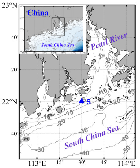 The Pearl River Estuary (PRE) situated in the southern China (Figure 1) connects the second largest river of China, Pearl River (PR), with the NSCS continental shelf. The PRE has about 70 km in length and 25 km in width, with an average bathymetric depth of about 5 m. The river runoff flows into the NSCS largely through eight river inlets on the western boundary of PR. Its discharge varies from ~3600 m3/s in winter to ~20,000 m3/s in summer, with an annual discharge of about 10,000 m3/s. Moreover, an irregular semi-diurnal mixed tidal regime dominates the PRE and adjacent waters, with a mean tidal range of about 1.4 m [27]. Affected by tides and river discharge, monsoon, and coastal currents, seasonal variability of the PR plume over the inner shelf is very remarkable [28]. In summer, the plume water entirely occupies the whole surface area of PRE and extends southeastward under the upwelling-favorable winds. In winter, when the downwelling-favorable winds prevail, a pronounced, persistent thermal plume front only appears on the western side of PRE where cold, fresh estuarine outflow meets warm, saline ambient coastal waters [24].