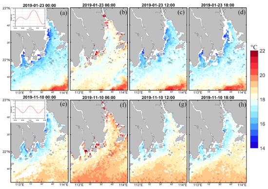 Ten-minutely sea surface temperature (SST) on 23 January (a–d) and 10 November 2019 (e–f). Corresponding tidal heights are shown in upper-left corners of (a,e). The subtitles in subplots (a–h) indicate the corresponding observation time (unit: UTC).