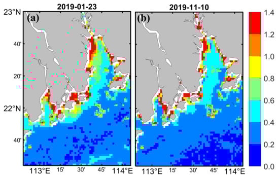 The Himawari-8 is a new generation geostationary satellite launched by the Japan Meteorological Agency (JMA) in October 2014. The AHI onboard Himawari-8 has 16 spectral bands from visible to shortwave infrared. Its spatial coverage spans from 80° E to 160° W and from 60° S to 60° N. The AHI provides ~2 km skin SST measurements every 10 min in clear sky over the full dish [26]. The comparisons with drifting and tropical moored buoy data for June to September 2015 show a rms difference of ~0.59 K and a bias of ~−0.16 K [29]. In this study, the Level-2 gridded Himawari-8 skin SST with a temporal resolution of 10 min are downloaded from the P-Tree System (https://www.eorc.jaxa.jp/ptree/, accessed on 20 June 2021) operated by Japan Aerospace Exploration Agency (JAXA). The SST data on 23 January and 10 November 2019 with rare clouds in the PRE and ambient waters are used for later analysis. The two dates correspond to the spring (23 January) and neap (10 November) tides respectively.