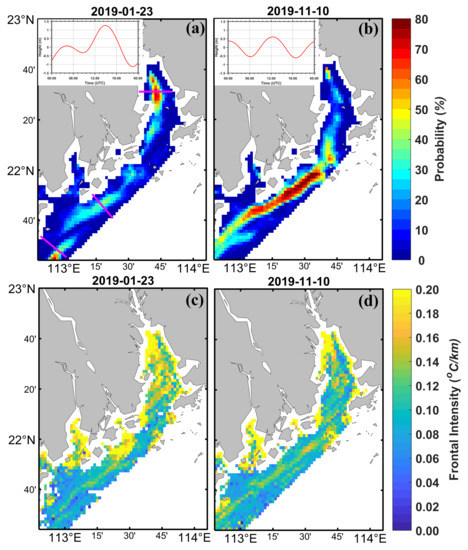 Ten-minutely frontal probability (unit: %, a,b) and mean frontal intensity (unit: °C/km, c,d) for 23 January (a) and 10 November 2019 (b). Magenta color lines in (a) denote three transects across the front. Corresponding tidal heights are shown in upper-left corners of (a,b).