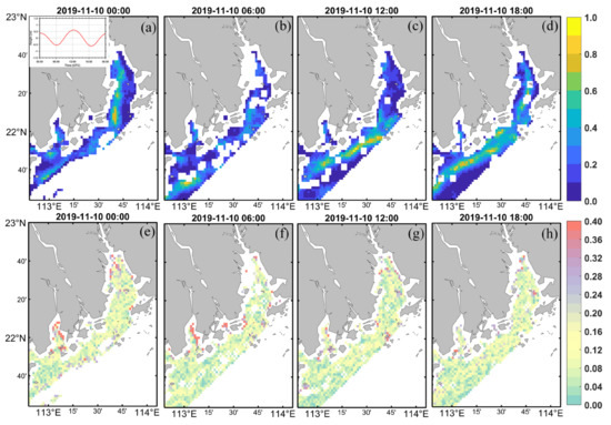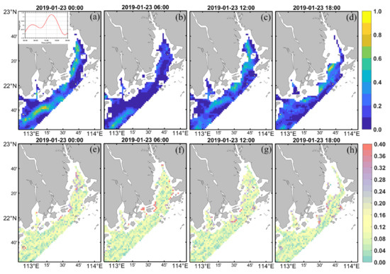 Spatial patterns of 10-minutely frontal intensity represented by both Jensen–Shannon divergence (JSD) (a–d) and gradient magnitude (GM) (e–h) on 23 January 2019. Corresponding tidal height is shown in upper-left corner of (a). The subtitles in subplots (a–h) indicate the corresponding observation time (unit: UTC).