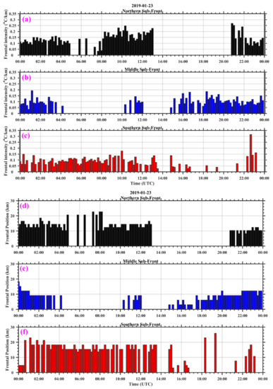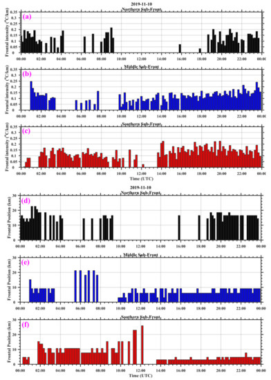 For the 10 November event (Figure 8), the frontal intensity in general exhibits strong-weak-strong fluctuations with the maximum amplitude of about 0.15 °C/km, while the frontal position tends to displace towards the coast, with a maximum displacement of about 15 km. For the three subfronts, the maximum diurnal variability is the middle subfront. Its intensity generally decreases between 01:00 and 10:00 UTC when the subfront displaces offshore (Figure 8b,e). The northern subfront has the lowest position variability (Figure 9d), the frontal intensity tends to decrease before 08:00, and is absent roughly between 09:00 and 19:00 UTC due to the front disappearance. Then, the subfront reproduces with an intensity of 0.15 °C/km (Figure 8a). For the southern subfront, the frontal intensity between 00:00 and 12:00 UTC is much weaker than between 14:00 and 24:00 UTC. The averaged GM ranges from 0.01 to 0.22 °C/km, with a mean amplitude of about 0.04 °C/km, while the averaged frontal position moves approximately 5 km towards the coast.