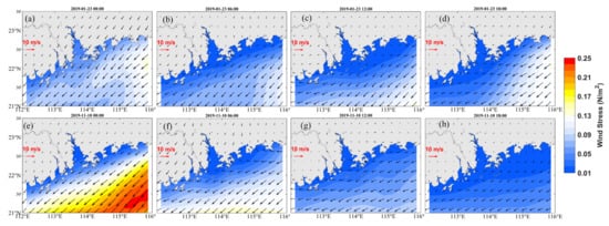 Six-hourly surface winds overlaid with wind stress (color shading) for 23 January (a–d) and 10 November 2019 (e–h). The subtitles in subplots (a–h) indicate the corresponding observation time (unit: UTC).