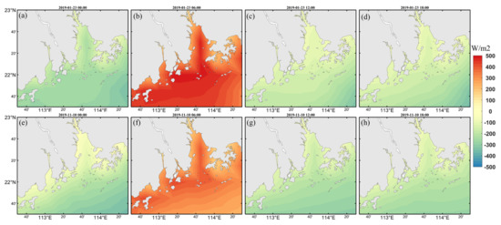 Six snapshots of hourly air-sea net heat fluxes for 23 January (a–d) and 10 November 2019 (e–h). Positive values represent seawater net heat gain. The subtitles in subplots (a–h) indicate the corresponding observation time (unit: UTC).