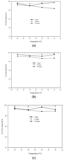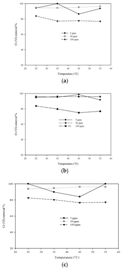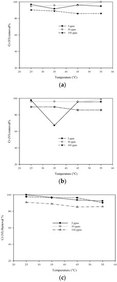 The rejection percentage calculated has revealed a range of removing percentages from 100% removal to as minimum as 80%. Figure 6 shows the rejection percentage of different concentrations at 4.5, 3.4, and 2.2 L/min feed flow rates and 10 bar operating pressure under different feed temperatures from 25 to 55 °C, it can be noted that samples with lower concentrations—5 ppm—were having higher removal than that obtained at 100 ppm indicating increasing concentration polarization on membrane surface thus decreasing Cr (VI) rejection. However, the impact of temperature under the tested conditions revealed a limited effect on the removal obtained.