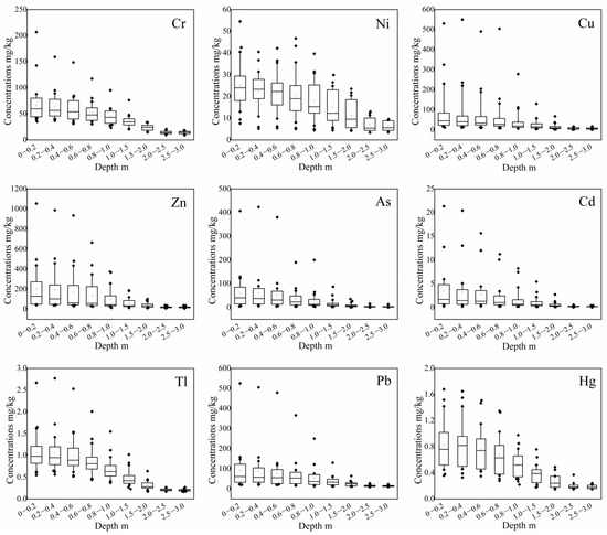 Figure 1 illustrates the concentration distribution of Cr, Ni, Cu, Zn, As, Cd, Tl, Pb, and Hg with depth in sediment cores from 23 sampling sites along the Beijiang River. Except for Ni and Cu, all other heavy metals fluctuated in the depth range of 0–0.6 m and showed a slightly decreasing trend. The results are comparable to those of previous studies, suggesting that the large fluctuation of heavy metals in surface sediments is mainly caused by human activities and hydraulic disturbance [31,32,33]. Given the prevalence of diagenesis, heavy metal concentrations declined rapidly in the subsequent depth of 0.6–2.5 m, indicating that heavy metals were gradually deposited into deep sediments under the action of sediment adsorption and gravity [34,35]. However, the deposition rate decreased with the increase of depth, and the rate of different metals varied slightly. After 2.5 m, heavy metal concentrations basically remained stable, indicating that sediments beyond this depth were barely disturbed by human activities and the diagenesis also decreased, which can be verified by isotope dating [36,37]. Therefore, the heavy metal concentrations in subsequent deep sediments can be defined as background values, which are defined as the deep control values (Cvd).