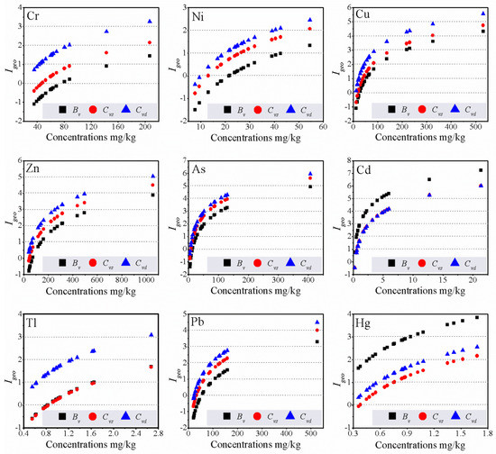 The Igeo values of Cr, Ni, Cu, Zn, As, Cd, Tl, Pb, and Hg in sediments were calculated based on different types of background values and total concentrations.
