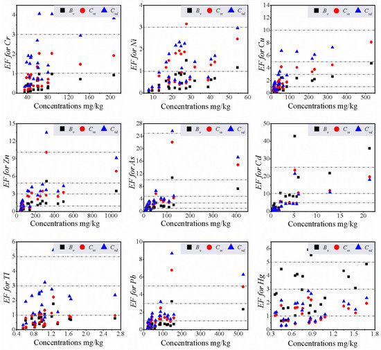 Igeo and EF are risk assessment indexes based on the total concentration and the background value of a single heavy metal, which plays a crucial role in indicating the pollution degree of heavy metal enrichment caused by anthropogenic sources. As shown in Figure 2, it was surprising that the Igeo value of each target heavy metal increased toward its total concentration with a significant decrease was observable toward the background value. Given that the background values of Cr, Ni, Cu, Zn, As, and Pb are in the order of Bv > Cvs > Cvd, the calculated Igeo values showed an opposite decreasing trend. As an example, the range of Igeo values for Cr based on Bv, Cvs and Cvd were −1.09 to 1.45, −0.40 to 2.14, and 0.72–3.27, respectively, and the corresponding evaluation levels also changed significantly, with the highest level showed moderately polluted (Bv) to heavily polluted (Cvd). These results indicate that Igeo values are only related to the total concentration of heavy metals based on selected background values and did not be affected by sediment properties [42]. However, sediment properties and composition can influence the availability of heavy metals in sediments and thus affect the risk assessment [43]. In addition, the risk values of heavy metals with the same content may differ due to the different background values for each type [44]. In contrast, given the EF value is not only affected by total concentrations and background values of heavy metals, also related to the distribution of conservative elements in the matrix. Figure 3 revealed that there was hardly any correlation between EF values of target heavy metals and total heavy metal contents, especially Tl and Hg, indicating that the EF value is susceptible to environmental geological factors [44,45]. This kind of comparison has not been mentioned in previous studies, but it is certain that comparability between these indicators clearly exists.