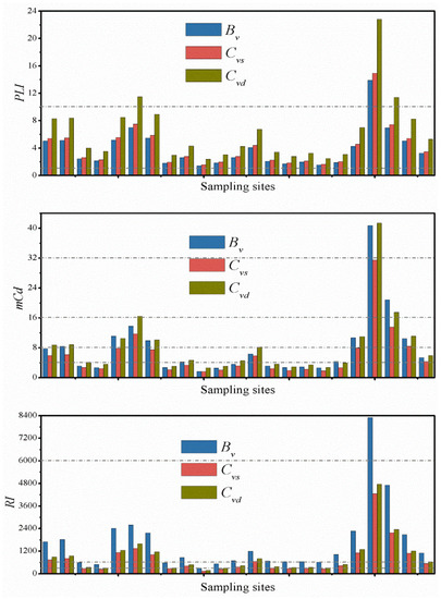 In contrast, PLI, mCd, and RI are indicators to evaluate polymetallic composite pollution based on background values, which can reflect the comprehensive risk of heavy metal enrichment in each sampling area. As shown in Figure 4, although the three indicators are all calculated according to Cf value, their subsequent change trends varied greatly under different background values. PLI showed an increasing trend of Bv < Cvs < Cvd, and mCd followed an order of Cvd > Bv > Cvs, while RI was in the order of Bv > Cvd > Cvs. These differences have rarely been addressed in previous studies [5]. The main reason may be that the three kinds of background values of each heavy metal are always different, and the total concentration of heavy metals at each sampling site also varies significantly, which in turn varies with the heavy metals [31,47]. What counts is that such a great variation in toxicity coefficients inevitably lead to the reverse effect of individual heavy metal risks on the combined risk [6]. Given the difference of total concentrations of Cd reached a maximum of 88.9 times, and the Bv value of Cd was smaller than that of Cvs and Cvd, the mCd and RI values were comparable to or significantly higher than those of the other two. Therefore, it can be inferred that the difference of background value and high risk of a single heavy metal has relatively little influence on PLI, while RI, influenced by the combination of background value and toxicity coefficient, should be closer to the real risk effect.