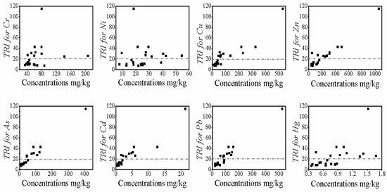 The TRI values of Cr, Ni, Cu, Zn, As, Cd, Pb, and Hg in sediments based on SQG values (TEL, PEL) and total heavy metal concentrations.