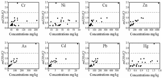Mean ERM quotient (mERMQ) is proposed for assessing the potential effects of multiple heavy metal contamination in sediment. The sediment quality guidelines were developed from biological toxicity test of the benthic environment and classified into three levels by ERL (effect range low) and ERM (effect range medium) as rarely (<ERL), occasionally (ERL-ERM), or frequently (≥ERM) associated with adverse biological effects [28,29]. ERL and ERM values of target heavy metals are shown in Table S4. The mERMQ is calculated as follows: