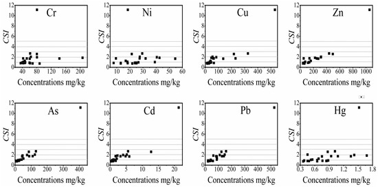 The CSI values of Cr, Ni, Cu, Zn, As, Cd, Pb, and Hg in sediments based on SQG values (ERL, ERM) and total heavy metal concentrations.
