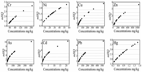 The mHQ assesses levels of contamination by describing each metal concentration observed in sediments with SQGs. The evaluation of mHQ is of utmost importance since it evaluates the risk of individual metal to the biota and the aquatic environment [52]. With respect to the mHQ values obtained, it was completely unexpected that they showed a significant positive linear relationship with individual heavy metal content, and increased towards the increasing of the content of heavy metals (Figure 8), indicating that the mHQ value is only related to the total concentration of heavy metals and has nothing to do with sediment properties [7]. Moreover, Figure 8 also showed the content distribution and corresponding risk of each target heavy metal in the investigated area. Therefore, the corresponding risk can be effectively predicted by measuring the content of heavy metals.