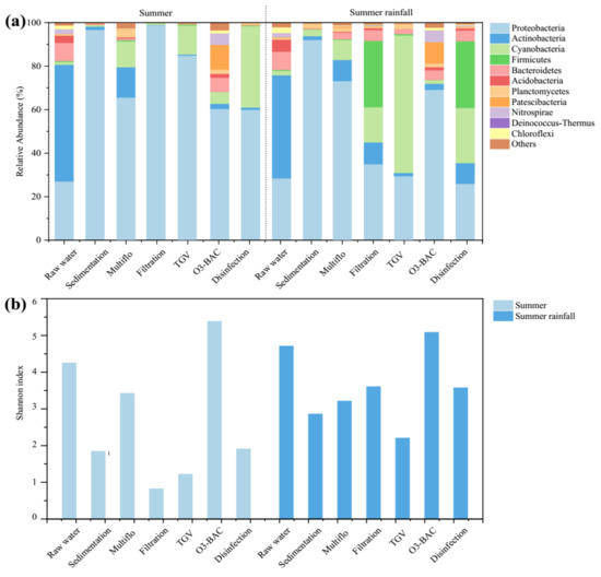 (a) Relative abundance of dominant taxa at the phylum level and (b) Shannon diversity index based on class identity OTUs in water samples at each treatment step before and after the rainfall event in summer.