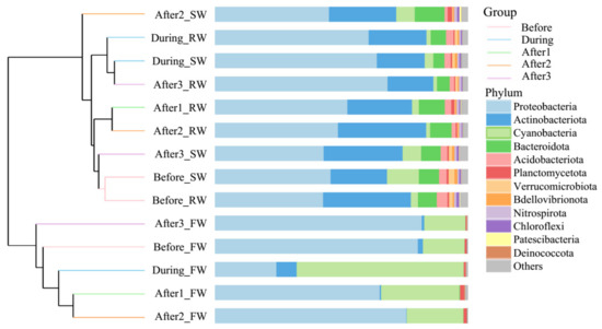 Bray–Curtis similarity-based dendrogram showing bacterial community composition in source water (SW), raw water (RW) and finished water (FW) during the five-day super typhoon period. The sampling dates are indicated by colored lines (before, during and after one, two and three days of the typhoon event). For each sample, community composition (phylum level) is indicated by bar plots.
