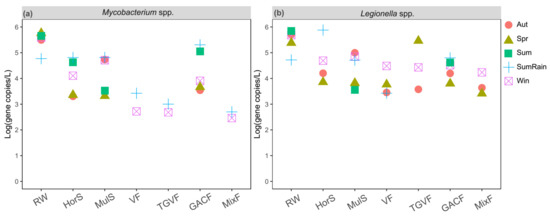 Target opportunistic pathogens, including (a) Mycobacterium spp. and (b) Legionella spp., in water samples at different water treatment stages and at different sampling time points. RW, HorS, MulS, VF, TGVF, BACF, and DisF were the abbreviations of raw water, horizontal flow sedimentation, Multiflo sedimentation, V-type filtration, TGV filtration, O3-BAC filtration, and disinfection, respectively. The different colors and shapes represent different seasons. The results of summer rainfall sample were removed due to insufficient DNA volume which cannot be used to verify the primary qPCR results.