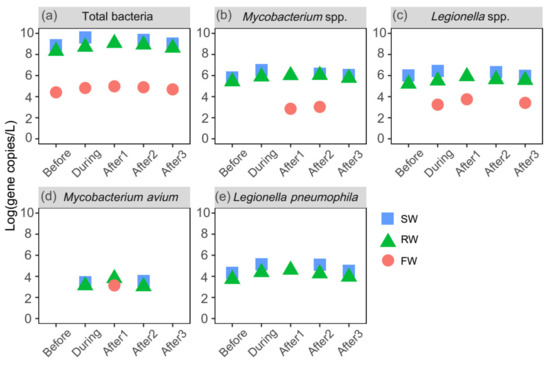 (a) Total bacteria and opportunistic pathogens, including (b) Mycobacterium spp., (c) Legionella spp., (d) Mycobacterium avium, and (e) Legionella pneumophila in source water (SW), raw water (RW) and finished water (FW) during the five-day super typhoon period (before, during and after one, two and three days of the typhoon event). The different colors and shapes represent different sampling sites. After1 SW sample is missing due to miscommunication during sampling.