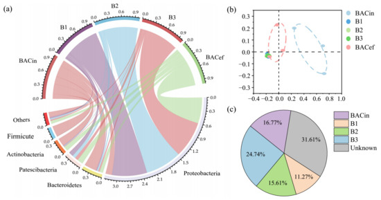 (a) Relative abundance of dominant taxa at the phylum level in BAC influents (BACin) and effluents (BACef) and biofilm samples from the top (B1), middle (B2) and bottom (B3) of the reactor. The data were visualized using the circlize package with R. The upper half circle represents every sample composition at phylum level, and the lower half circle indicates the proportion of a particular taxon in different samples. (b) Non-metric multidimensional scaling (NMDS) plot of BAC influents, effluents and biofilm samples based on Bray–Curtis distance. Symbol color represents different samples. (c) Results of SourceTracker analysis showing the contribution of BAC influents and different depth of biofilm samples to BAC effluents.