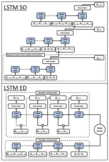 Structures of the LSTM SO (top diagram) and LSTM ED (bottom diagram) models for reservoir water level prediction.