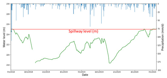 An overview of the data obtained in this study is presented in Figure 3. The maximum water level was equal to the height of the spillway, which is 225 m above sea level. Spill water was observed in both 2018 and 2020. The water-level data could not be obtained from 20 October to 5 November 2018, because of a problem with the data-transmission device. Table 4 summarizes the data obtained during the study.